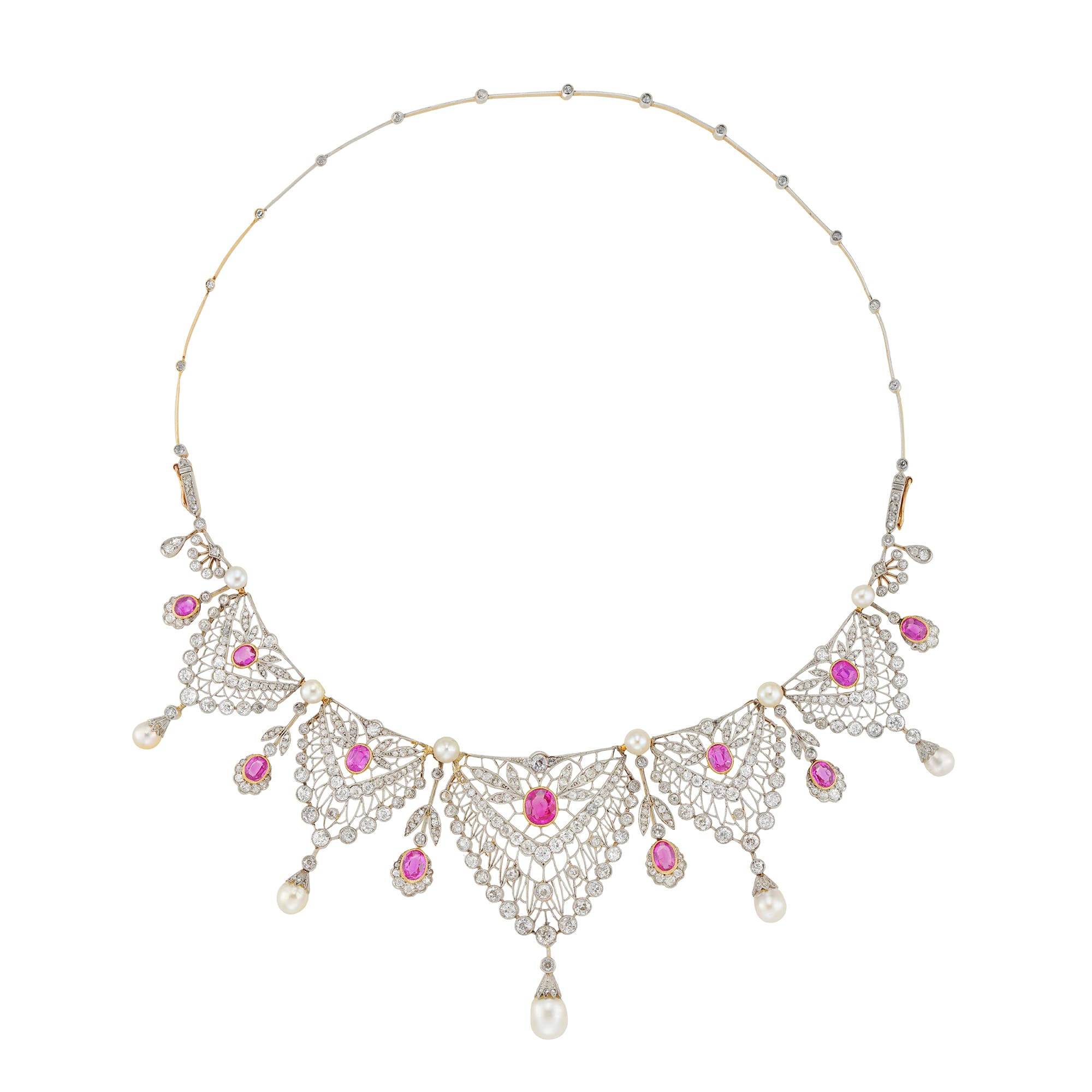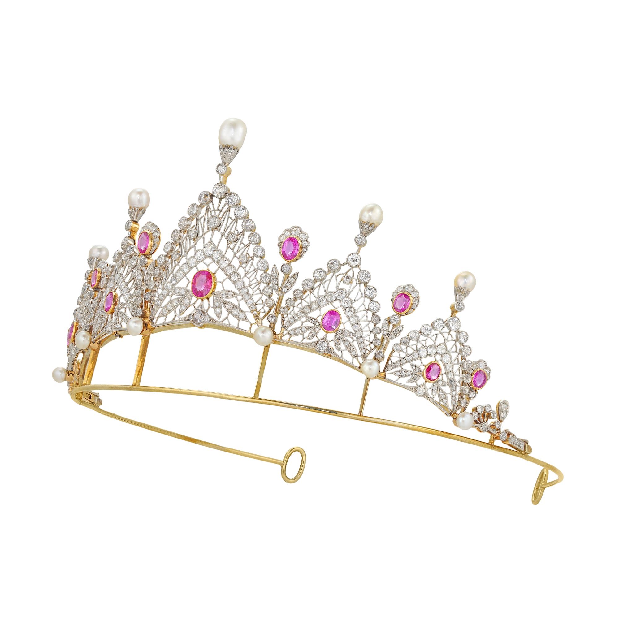 More informationAn Edwardian ruby, natural pearl and diamond-set tiara in the Russian style, consisting of five éventail panels graduated from the center, each panel centrally-set with an oval faceted ruby to an openwork diamond-set surround and a natural pearl-set top, embellished with six similarly jewelled floral spacers set, each set with a ruby and a natural pearl, the rubies estimated to weigh 8 carats in total, accompanied by GCS report stating to be of Burmese origin with no indications of heating and the pearls to be natural of saltwater origin, the old brilliant and rose-cut diamonds estimated to weigh 11 carats in total, all mounted in platinum and yellow gold, with silver gilt tiara frame, convertible to a necklace and accompanied by diamond-set back section, circa 1905, measuring 7.3x14cm, gross weight 62 grams.